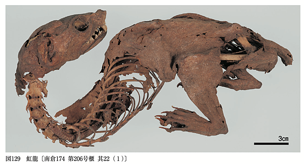 舉例來說,正倉院保存一具被稱為「虹龍」的動物木乃伊。說到這具長度約 40 公分、看似哺乳類的木乃伊是何時出現於正倉院,大約可以追溯至 1429 年。