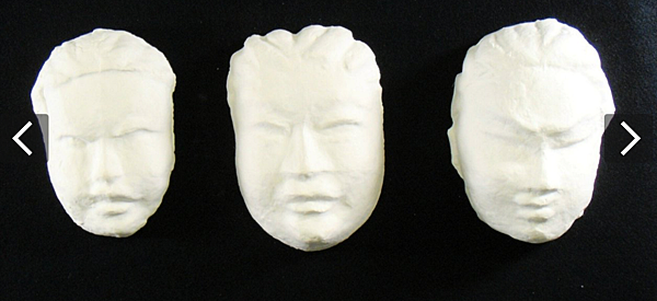 透過石膏復原的阿修羅像臉部原型,從左至右分別為右臉、正臉、左臉。